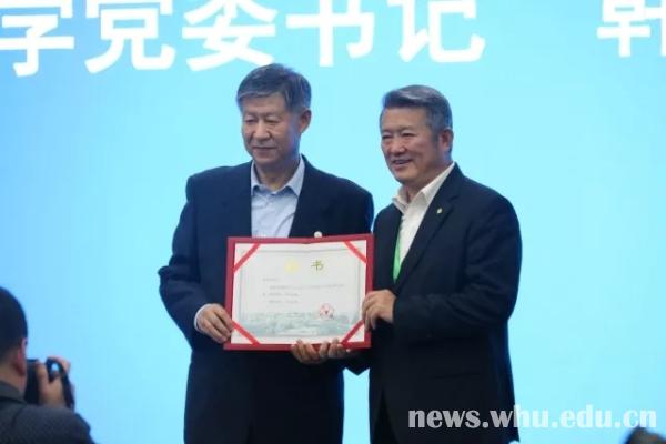 冯友梅代表学校与捐赠者签署了人才引进基金捐赠协议,韩进为捐赠人颁发捐赠证书。