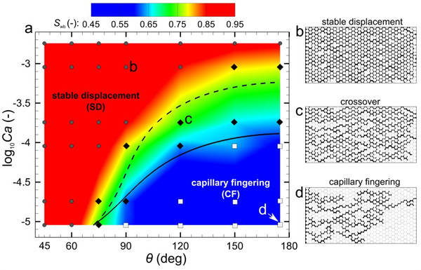 研究人员发现,在孔隙介质中,当大粘度流体驱替小粘度流体时,由于毛细力对流体界面的失稳效应,多相流的驱替锋面在大流速条件下表现为稳定流,而在小流速条件下表现为指流。这种“稳定-失稳”机制与介质的湿润性密切相关。他们通过理论分析,提出了多相流流动模式相图,揭示了湿润性和流速如何控制指流的发生。进一步发现,在强亲水条件下,多相流呈现出“角流”现象,他们根据大规模数值模拟结果,提出了“角流”发生的临界条件。这种“角流”机制被广泛应用于生物、医学的微流体设计中。